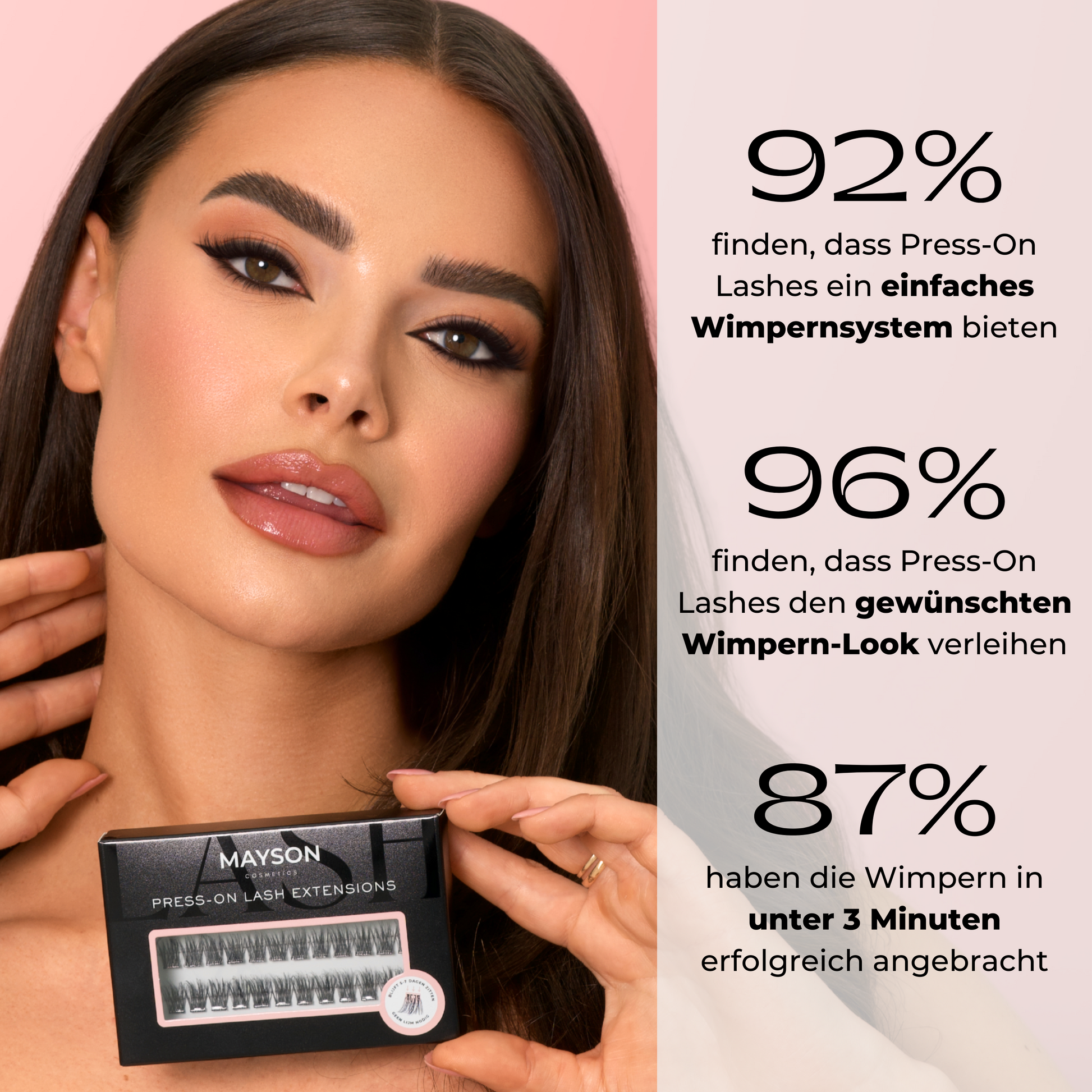 Sconsigliamo di applicare il mascara. Poiché le nostre Press-on Lashes sono già voluminose e definite, non è necessario. Inoltre, l'attrito della spazzola del mascara può influire sull'adesione delle ciglia.