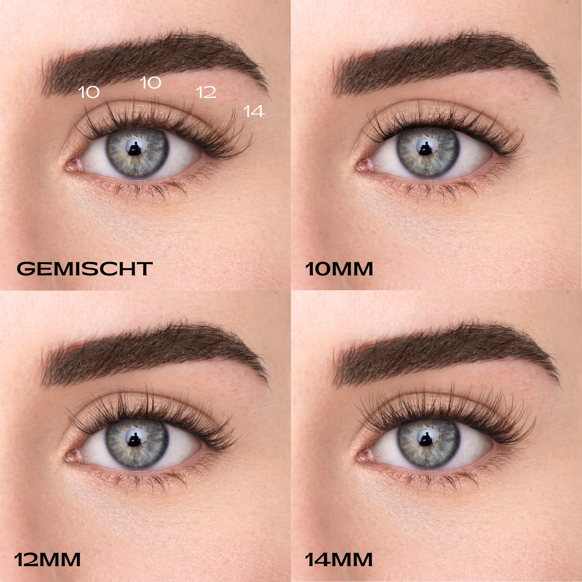La scatola di ciglia contiene 3 file con lunghezze di ciglia variabili: 10, 12, 14 mm. In questo modo, puoi creare il tuo look di ciglia. Opta per un look classico a cat-eye o mantieni una lunghezza costante per l'uso quotidiano.